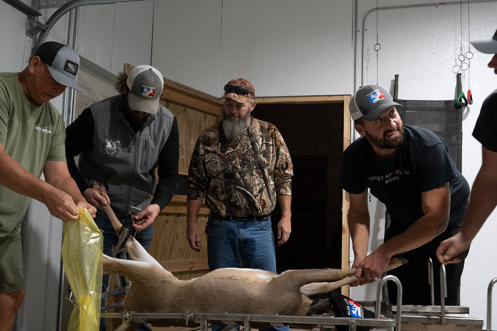 From left to right: Herb White, Jon Nese, Greg Severance, Russel Ogle, and Brandon White. Herb White, owner of Middle Ground Whitetails, takes the deer's left leg while Jon Nese, formal MLB pitcher for the Mets and owner of Major League Whitetails and Double Play Hunting persevere, secures the right leg to the stretcher as Greg Severance watches; Russel Ogle, manager of Major League whitetails and Double Play Hunting, and Brandon White, co owner of Middle Ground Whitetails, prepare to secure the deer’s front two legs to the stretcher. The lengthy process of artificial insemination begins with placing an unconscious doe on a stretcher where their legs are fastened in order to ensure they remain still during the process. After this they will be prepped and then have buck sperm injected into the ovaries in order to ensure the doe will have fawns that can grow into the most desirable deer for people to hunt. This process brings together deer farmers from around Ohio to help Major League Whitetails complete the process with their deer and in return MLW allows them to bring deer in for AI at their facility.