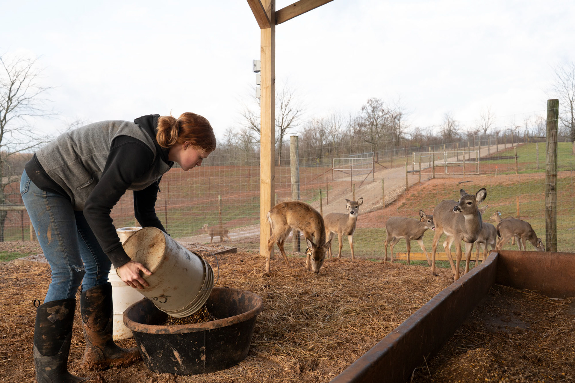 At 8 A.M. Rachel Bahl, assistant manager at Major league whitetails, sets out with a side by side full of buckets of a grain, molasses mix to feed the deer held in the farm. This mix allows the deer to get real nutrition which will help them grow into something worth hunting. The deer alone require 490lbs of grain that is distributed through each pen. Rachel pours the mix into feeding troughs, after doing this she also replaces the water for the deer, as the 1 year old bucks watch.