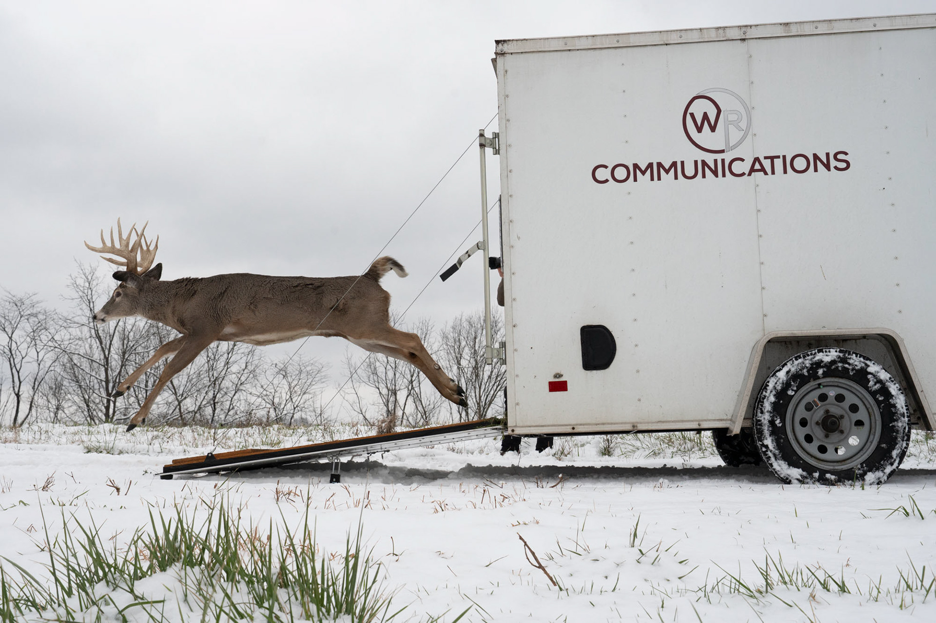 The newly purchased white tail buck from whiskey river whitetails, a deer farm paid for by whiskey river communications, leaps out of the container into the hunting preserve on Fisher Rd in Athens, Ohio.